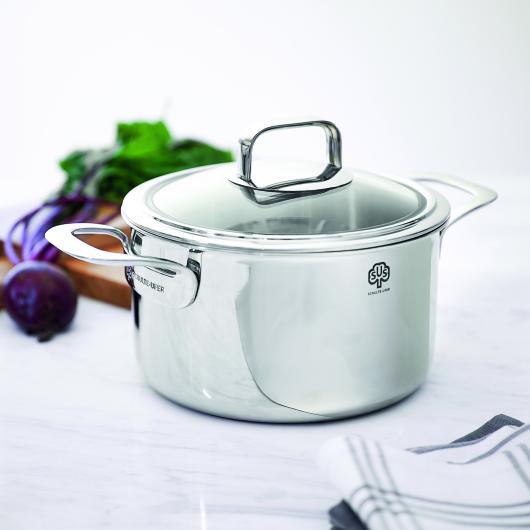 Inspired by nature is the excellent 3-layer material that defines Skagen. Like the individual layers of an onion, two protective stainless steel layers encase a heat-conducting aluminum layer, which, in contrast to conventional cookware, is pulled up to the rim. The aluminum transfers heat evenly and efficiently from the stovetop into the rim of the pot or pan – on induction and gas as well as on all other common types of stoves. Thanks to the heat-resistant, break-proof quality glass lids, you can keep an eye on your food even when covered and thus the heat in the cookware. And since the highly polished items from Skagen with their handy cast handles are timelessly beautiful, they are also wonderful as serving dishes. With the lid on, the food stays at the same temperature for a long time. And because Skagen is dishwasher safe – except for the glass lids and pan coatings – subsequent cleaning is no problem either.