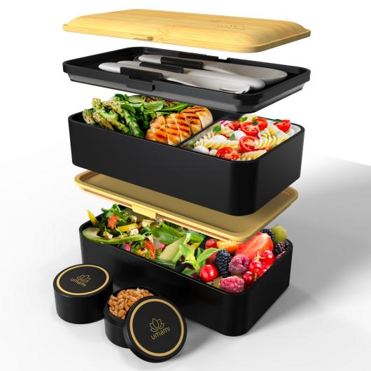 Our Original Adult Bento Lunch Box is a proven bestseller, designed to attract customers looking for a versatile and stylish meal solution. It includes a complete cutlery set, two sauce jars, and two movable dividers, all neatly organized in a double-layer bento box.