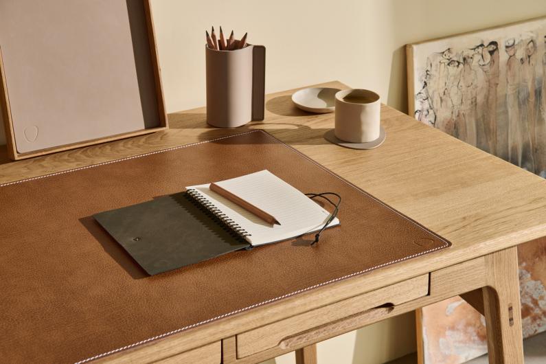 Embracing simplicity and sophistication, the carefully curated office mats in recycled leather provide the ideal basis for the workstation. With its clean lines there are no distracting elements, while the practicality of a work mat eliminates the concern of protecting the desk from water glass rings and coffee cup stains.