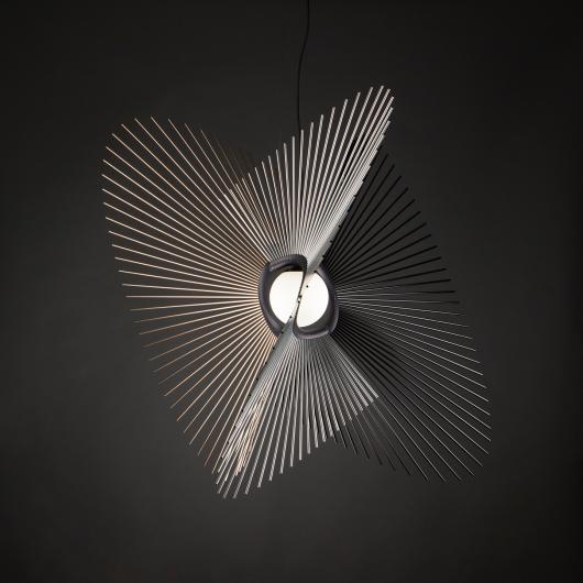 The organic design of its form provides a new and surprising visual experience from every viewpoint. The fixture is available in three sizes, with diameters ranging from 107 cm to 181 cm, making it perfectly suited for rooms with varying ceiling heights and floor areas. The precisely machined aluminum elements can also be requested with a special three-color finish, which makes the lamp even more spectacular and unique. Thanks to the materials used, the lamp is surprisingly lightweight. It is shipped disassembled, which significantly reduces the environmental footprint and costs. Assembly is very simple with the help of the included guide.