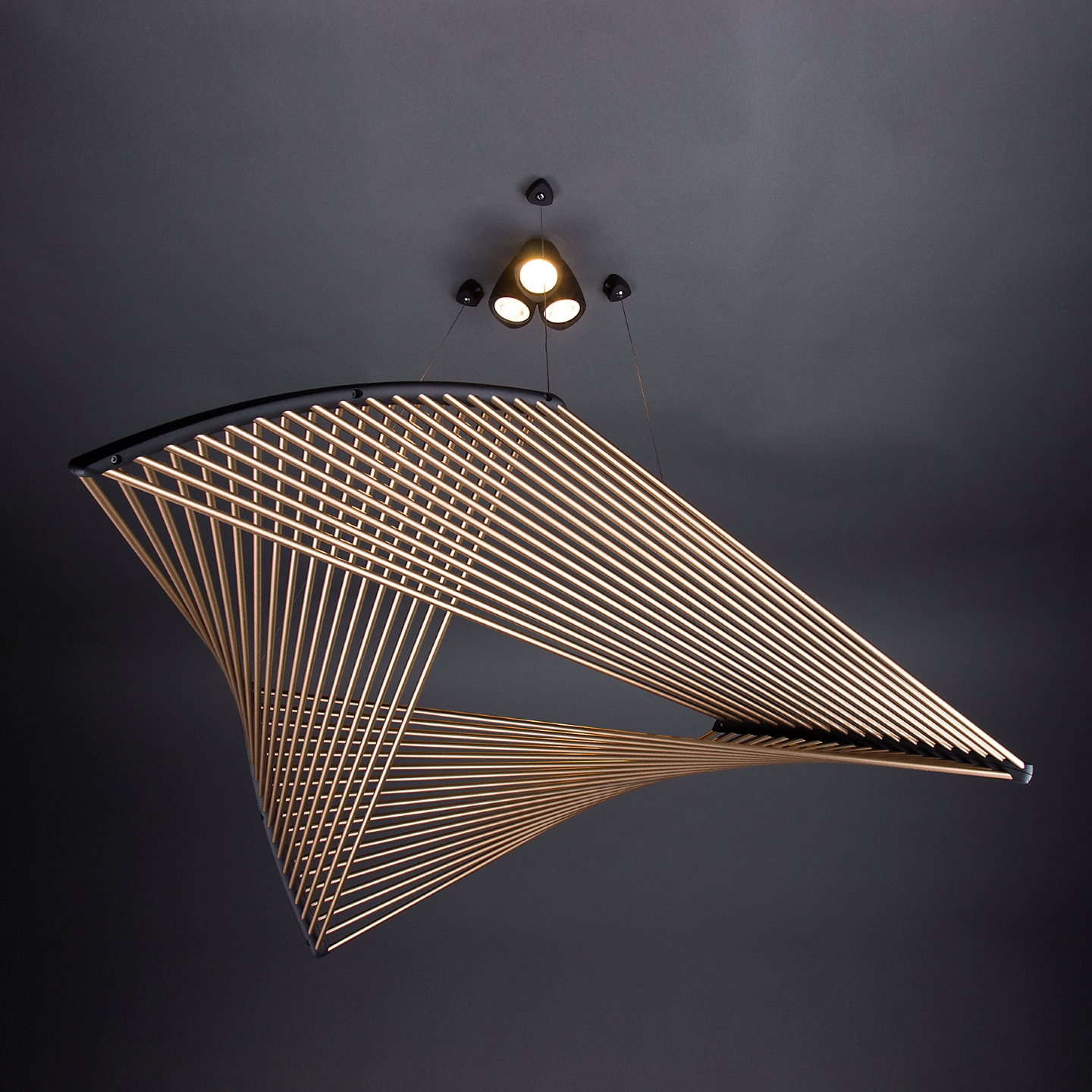 Constructed from anodized aluminum tubes and a 3D-printed structure, the fixture casts a delicate play of light and shadow. The latest version, the Leaf 127, introduces a larger size and a two-toned finish. The contrasting tips of the rods further highlight the lamp's unique, dynamic form, all while retaining its original, airy elegance.