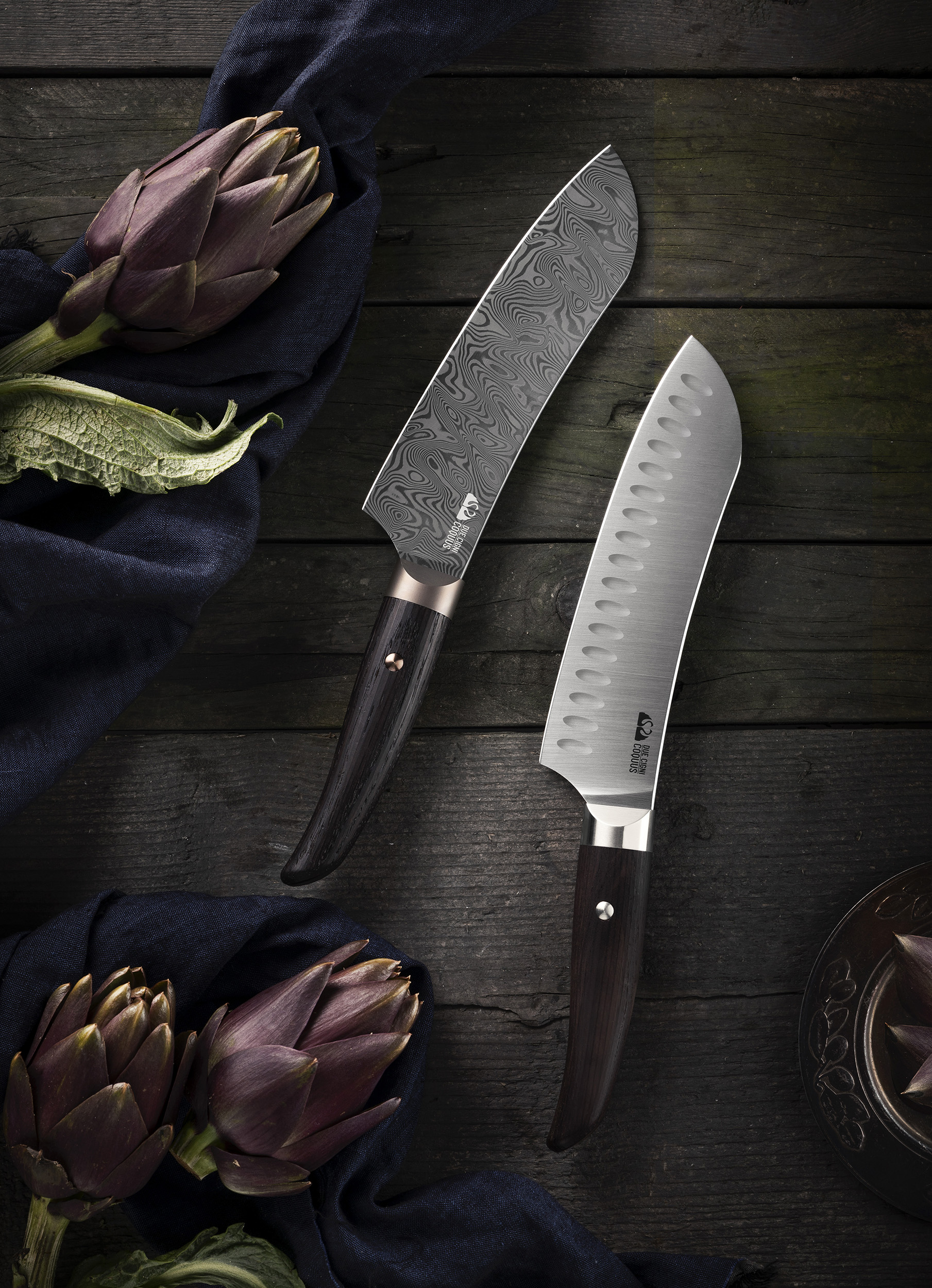 Coquus Heritage | Is characterized by an unmistakable style, a union of precious materials such as damask blades and modern ones such as the oxidized titanium bolster. The handle in granadillo, an original and unique wood, with a delicate essence that is a witness of time.