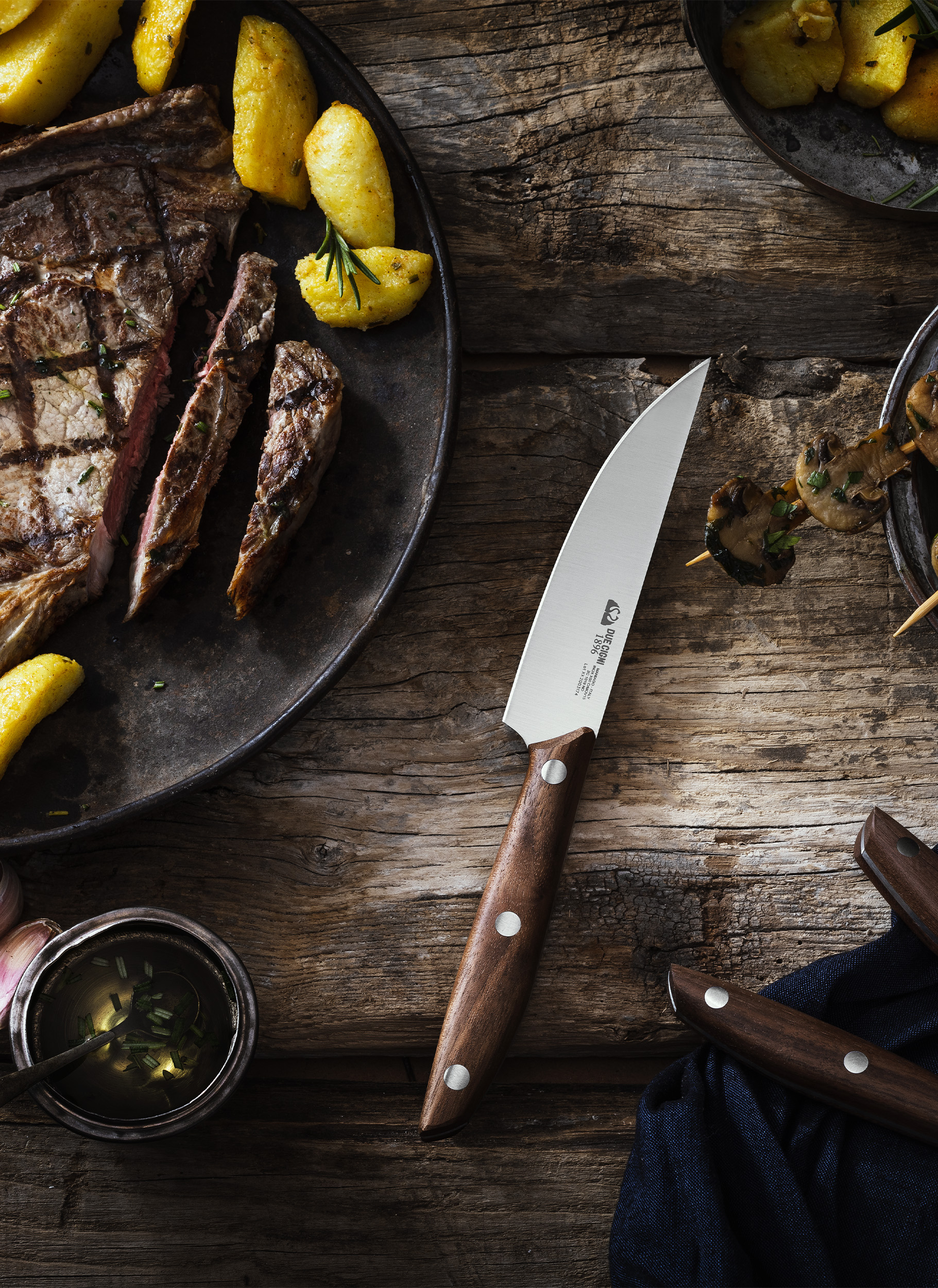 Coquus Home | The design follows the lines of the Heritage series, but the range has been expanded to include other models for both intensive professional use and everyday, home use. The precision of the 4116 (X50CrMoV15) stainless steel blades, finished and sharpened by hand, ensures a perfect cut. Smoked oak handle, a highly precious essence, refers to the culinary tradition of smoking meat.