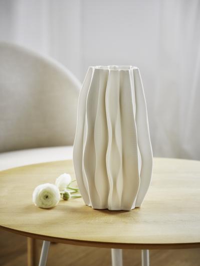 PLISSEE, the large, bulbous sister of Philippi´s FRAPPEE vase, is created using the same elaborate 3D printing process and then fired at 1,200°C in the kiln. The unique layered structure of hundreds of layers in fascinating contrast to the flowing, light pleated look is undoubtedly the hallmark of both vessels. FRAPPEE is also sealed watertight from the inside with a glaze up to half the height, because double simply holds better. Ideally, the fine structure should simply be cleaned by hand with a soft, damp cloth so that it does not gradually wash out in the dishwasher. Even individually, the vases are a dream in combination with cheerful, colourful flower bouquets; as a pair, they create a magnificent firework display.