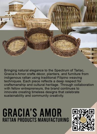 Bringing natural elegance to the Spectrum of Tarlac, Gracia’s Amor crafts décor, planters, and furniture from indigenous rattan using traditional Filipino weaving techniques. Each piece reflects a deep respect for craftsmanship and cultural heritage. Through collaboration with fellow entrepreneurs, the brand continues to innovate creating timeless designs that celebrate sustainability and community creativity.