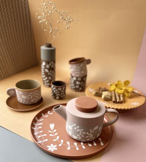 The stoneware teaset collection includes small tea pots, mugs, cake stand and a small vases.