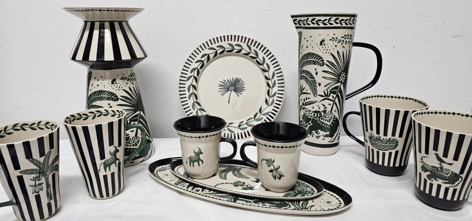 The Green Buffalo Tableware set includes different types of mugs, plates, jugs and vases which can be used flexibily in the daily life. The Vietnamese image of green banana trees and water buffalos pattern was created in different styles on each item, using the under-glazed decal transfer technique.
