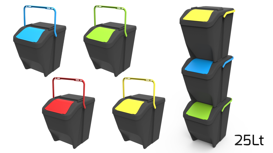 The cover’s design ensures stable and secure stacking of the bins up to four units, optimizing available space. The large lid and handle are coloured to easily identify the waste type, while the side hollows on the base provide an additional handhold and reinforces the structure. The strong handle ensures easy transport and emptying, one rotated to a vertical position, it stays in place to further facilitate handling. Each bin has a capacity of 25 liters and features teeth along the base edge to secure bag in place when needed.