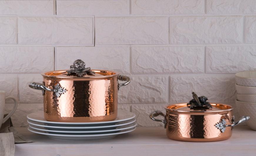 Hammered copper lined with practical stainless steel and enriched by luxurious, decorated silver plated knobs – heirloom quality cookware, worthy of being handed down through generations.