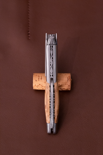 Luxury juniper wood wine opener which bee and plates are entirely hand-carved and decorated by one single craftsman. Item available in all common materials and delivered in a wooden box.