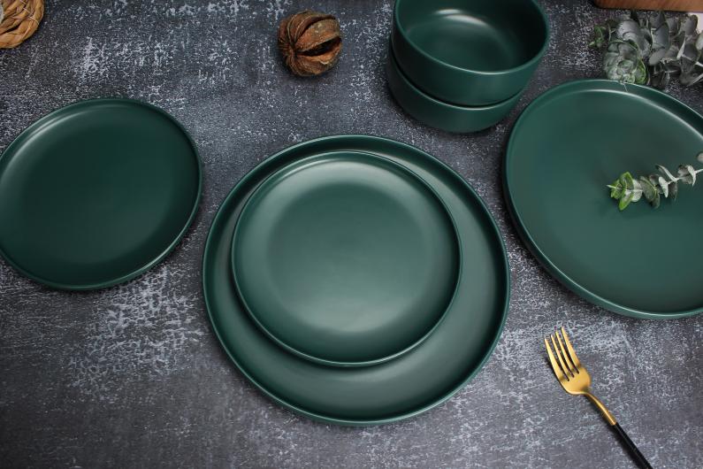 Presenting our collection of green matte stoneware dinnerware, seamlessly fusing time-honored stoneware craftsmanship with contemporary design. This set not only exudes qualities of robustness and endurance but also preserves the distinctive gloss and texture intrinsic to fine stoneware.