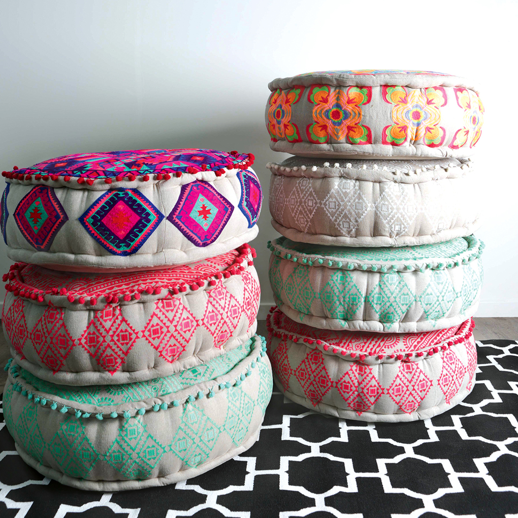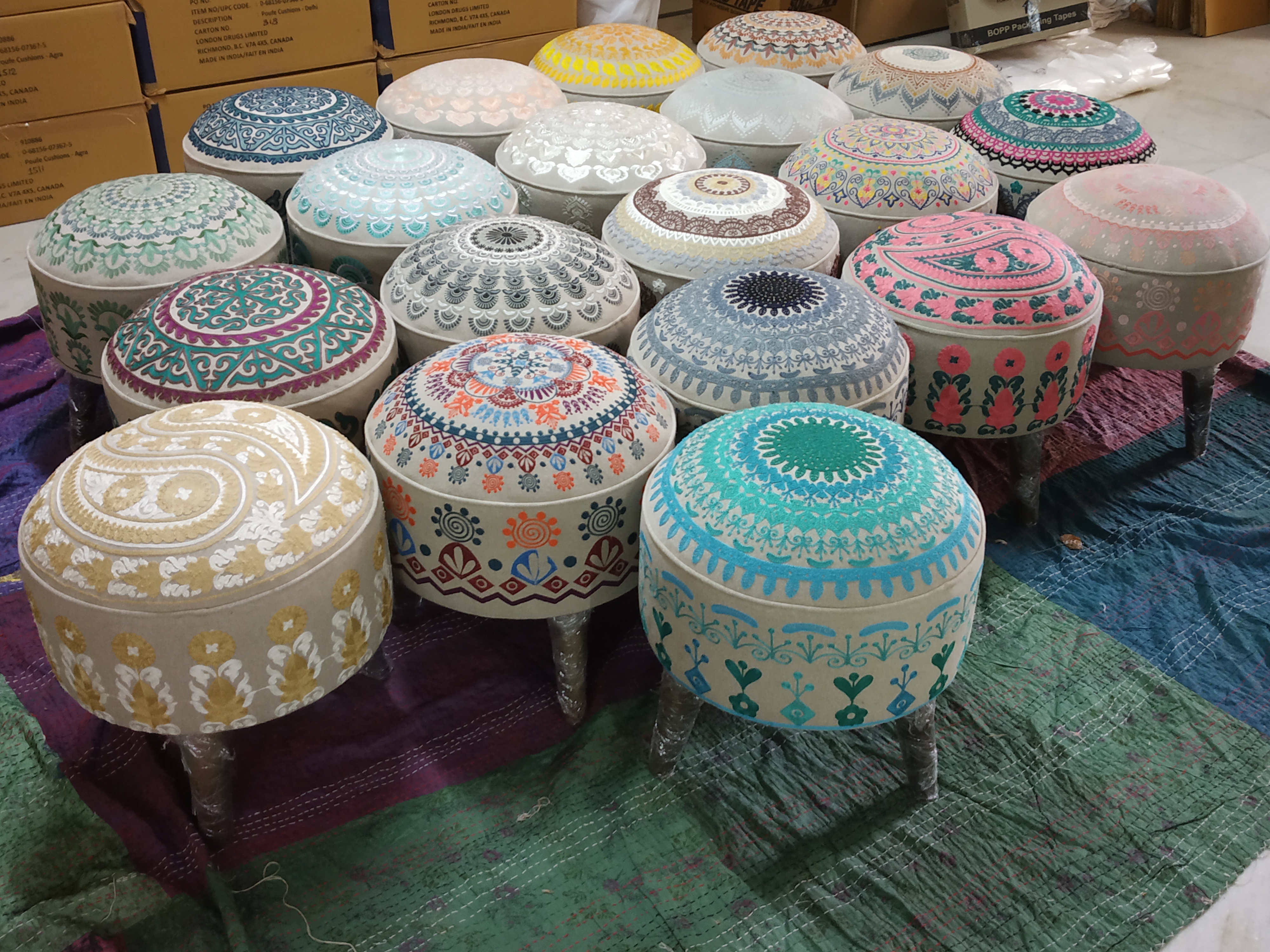 - Embroidery : All Kind pouf / ottoman , cushion cover , pillow cover , round cushion , floor cushion, heavy throw and bed cover