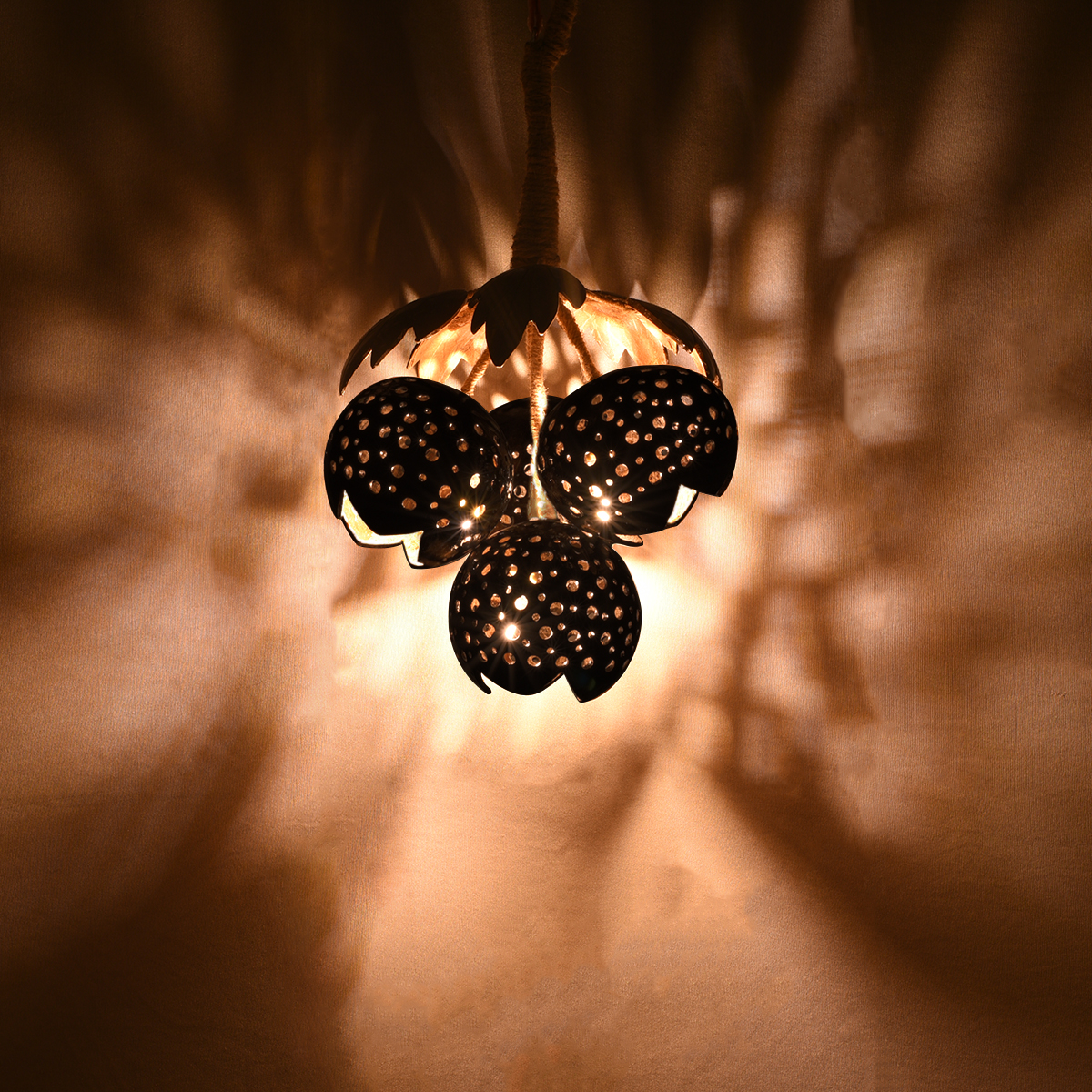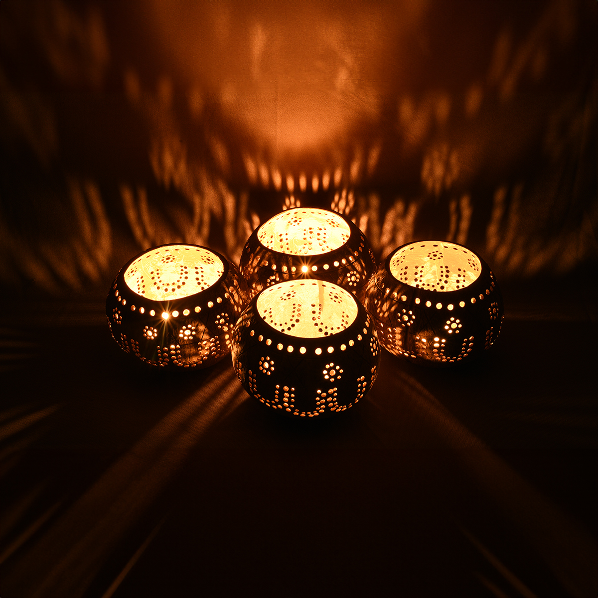 When lit, the intricate design allows soft rays of light to filter through the carvings, casting enchanting patterns across your room. The sturdy base ensures durability, while the combination of coconut shell artistry and peacock-inspired detailing makes it a true statement piece.
