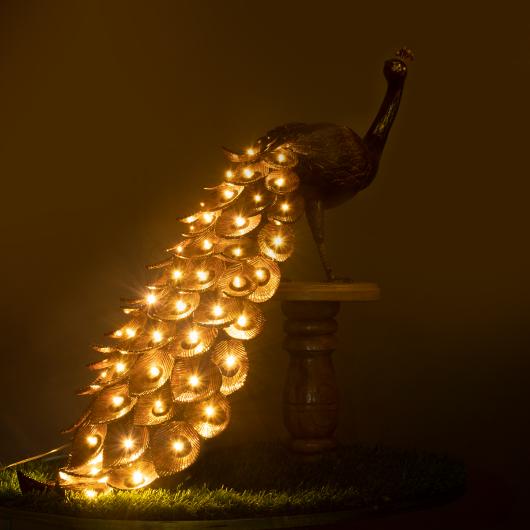 When lit, the intricate design allows soft rays of light to filter through the carvings, casting enchanting patterns across your room. The sturdy base ensures durability, while the combination of coconut shell artistry and peacock-inspired detailing makes it a true statement piece.