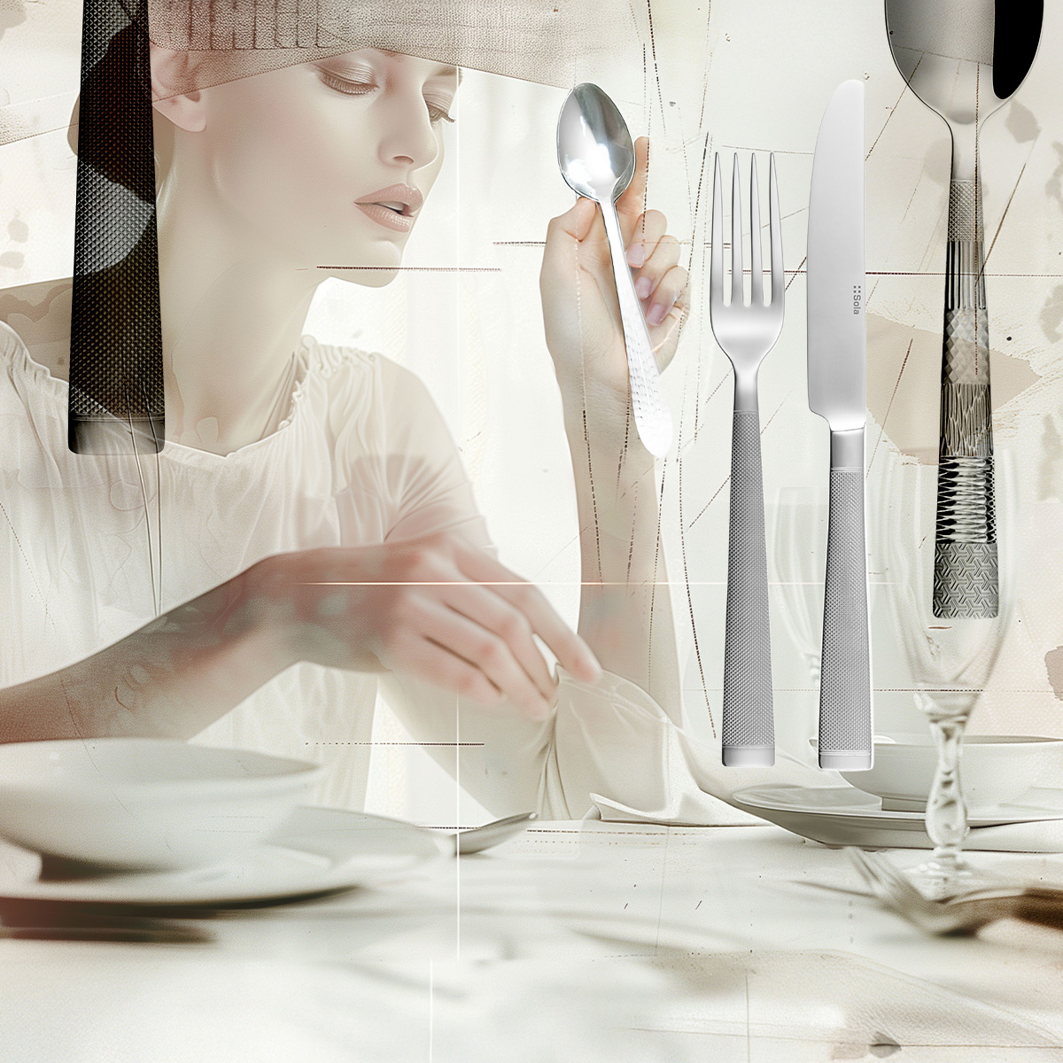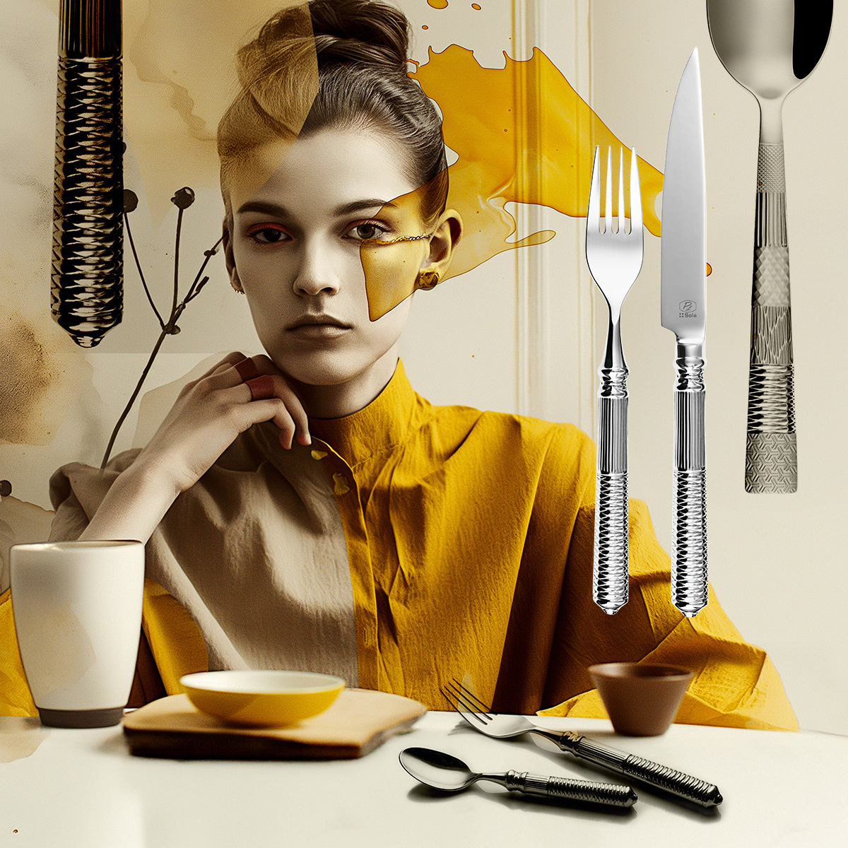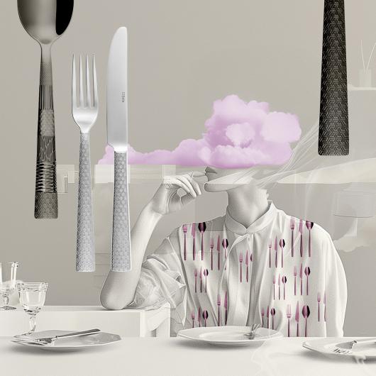 New shapes with a futuristic hint, yet a soft, refined overall impression. Clean silhouettes are complemented by a bolder geometric texture on the handle that adds depth. The polished surfaces catch the light while remaining calm and confident, giving the table setting a modern yet still elegant character. A choice for those who want a consistent style and a memorable first impression.