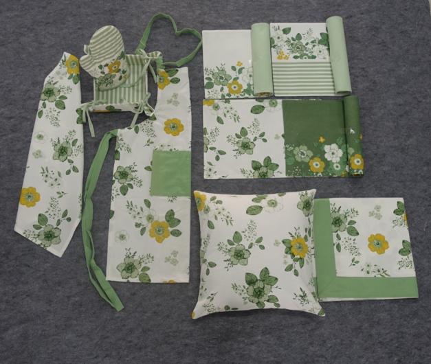 apron, glove,potholder,kitchen towel,tablecloth,napkin,fused placemat,runner,ribbed placemat, chairpad,box cushion,curtains,breadbaskets, long box cushion, cushions