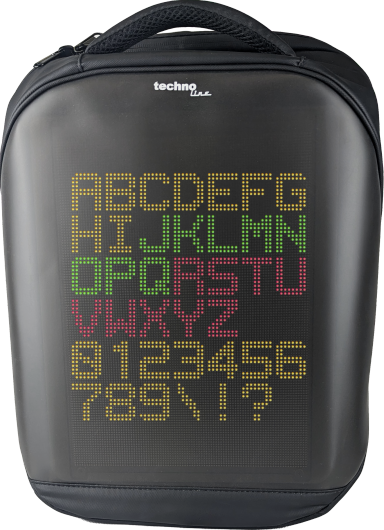 • Backpack with HD display • Operation via Bluetooth or WiFi and free LOY Space app (via your smartphone or tablet) • 96 x 128 pixels for own texts, images and moving animations • Made of nylon, oxford and synthetic fiber (TPU) • 21,5 liter capacity • With multiple compartments and space for up to 15.6 inch laptops • Suitable for commuting, cycling, traveling, office, school, outdoor and hiking • Ideal for personal messages and advertising