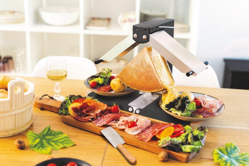 The device's two heating ramps can be adjusted in height to adapt to the size of cheese chosen (1/6 or 1/4 wheel) and move closer together as the portion is reduced.
