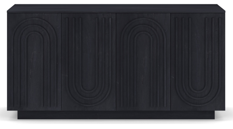 This modern, minimalist sideboard, crafted from mango wood, features a warm black finish. Its four-door cabinet showcases a raised, arched geometric pattern on the front, adding depth and texture to its clean lines. With its sleek silhouette and understated elegance, it’s the perfect addition to contemporary interiors, seamlessly combining functionality and style.